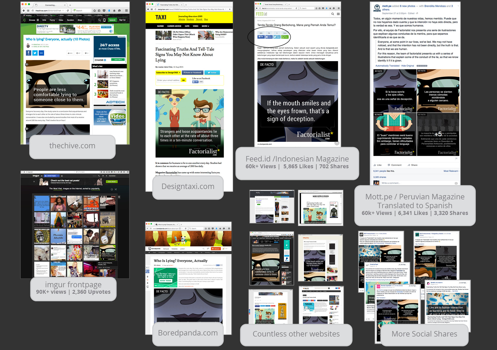 By leveraging social media and other channels with our original content, we’ve reached the frontpage of Imgur.com, cited thousands of times by other websites including theChive.com, designtaxi.com, neatorama.com, trendhunter.com, boredpanda.com, the matador network, and connected with hundreds of thousands on social media.